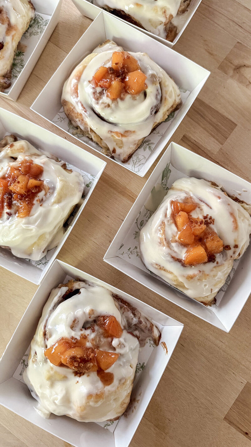 My signature cinnamon rolls are a labor of love, featuring tender, buttery dough that's rolled with a generous blend of cinnamon and brown sugar, then baked til done. Pillowy, with swirls of warm spice throughout, and is finished with a drizzle of creamy glaze that melts into every crevice. Traditional and seasonal ones are offered throughout the year and for custom orders.